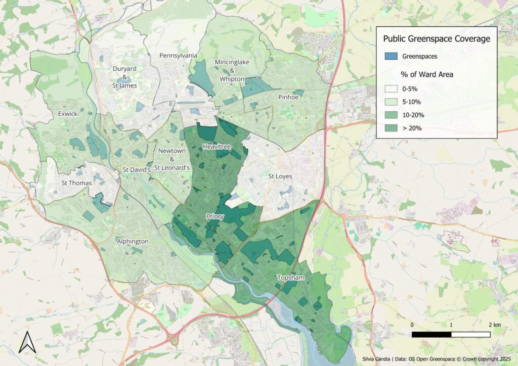 This analysis examines Exeter’s green infrastructure across two complementary lenses: publicly accessible green space, and priority habitats of conservation importance. Together they reveal something that a single dataset cannot: the difference between where people can go and where nature actually thrives.