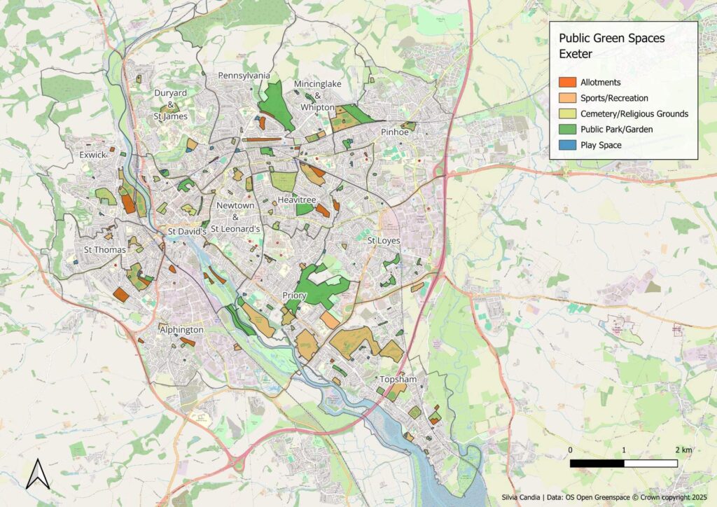 Using OS Open Greenspace, which maps parks, playing fields, allotments, play spaces, cemeteries, and other publicly accessible outdoor land, Exeter has 246 publicly accessible green spaces covering 399 hectares, around 8.5% of the city’s total area.